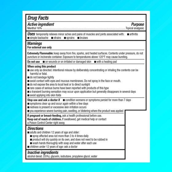 Active Ingredients: Menthol (16%), Purpose: Topical Analgesic, Inactive Ingredients: Alcohol Denat, (55%), Glycerin, Isobutane, Propylene Glycol, Water