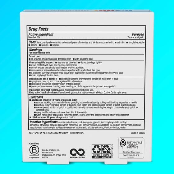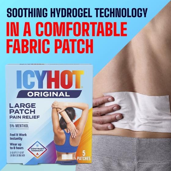 Make a comeback from pain with Icy Hot Original Pain Relief Patches, Large Size. Each pack contains 5 patches made for larger areas of pain that are powered by contrast therapy*, providing fast-acting relief for sore muscles and joints with a cooling sensation to dull pain followed by a warming sensation to relax it away. These patches use menthol 5% to target and relieve backaches, lower back pain; pain from strains, sprains and bruises; and arthritis pain. Easily apply the comfortable fabric patch to the affected area and wear it for up to 8 hours. Keep Icy Hot in your gym, work, or travel bag for powerful pain relief on the go. *Refers to the cooling and warming sensations