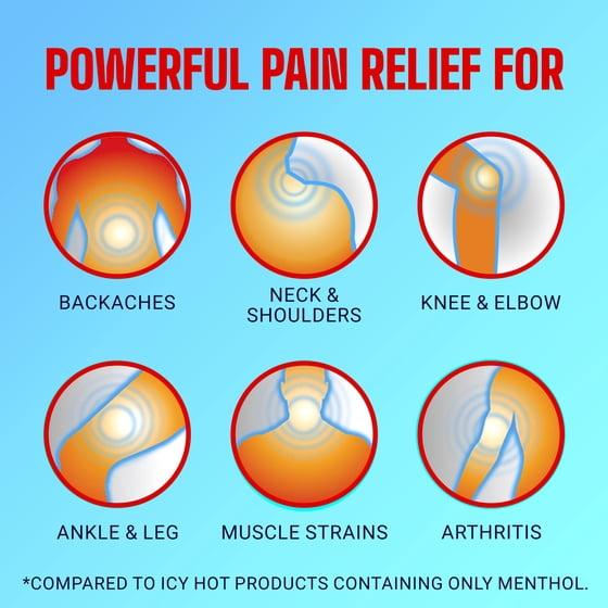 - POWERFUL RELIEF: Targeted muscle and joint pain relief for backaches; lower back, neck, shoulder, knee, elbow, ankle and leg pain; pain from strains, sprains and bruises; and arthritis pain