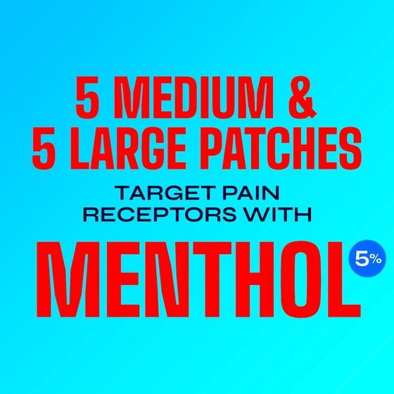 Make a comeback from pain with Icy Hot Original Pain Relief Patch Variety Pack. Each pack contains 5 medium and 5 large patches that are powered by contrast therapy*, providing fast-acting relief for sore muscles and joints with a cooling sensation to dull pain followed by a warming sensation to relax it away. These patches use menthol 5% to target and relieve backaches, lower back, neck, shoulder, knee, elbow, ankle and leg pain; pain from strains, sprains and bruises; and arthritis pain. Easily apply a comfortable fabric patches to the affected area and wear it for up to 8 hours. Keep Icy Hot in your gym, work, or travel bag for powerful pain relief on the go. *Refers to the cooling and warming sensations