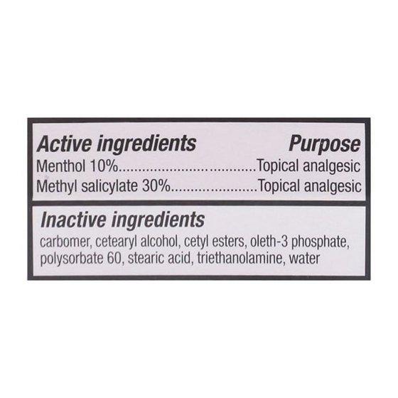 - non-greasy and temporarily relieves minor pain associated with: Arthritis, Simple Backache, Muscle Strains, Sprains, Bruises and Cramps