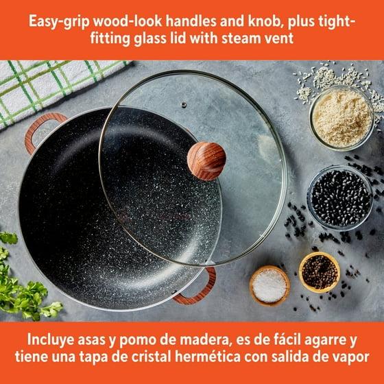 - EFFICIENT AND USER FRIENDLY: Even heat distribution and retention for consistent cooking results, with wood look easy grip handles and knob for comfortable handling, and a tight fitting glass lid with steam vent for optimal cooking control
