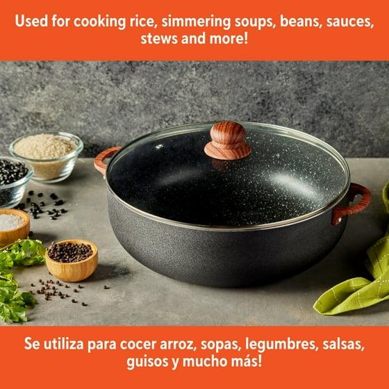 IMUSA 9.0qt Black Stone Aluminum Speckled Ceramic Caldero with Glass Lid & Wood Look Handles, Black