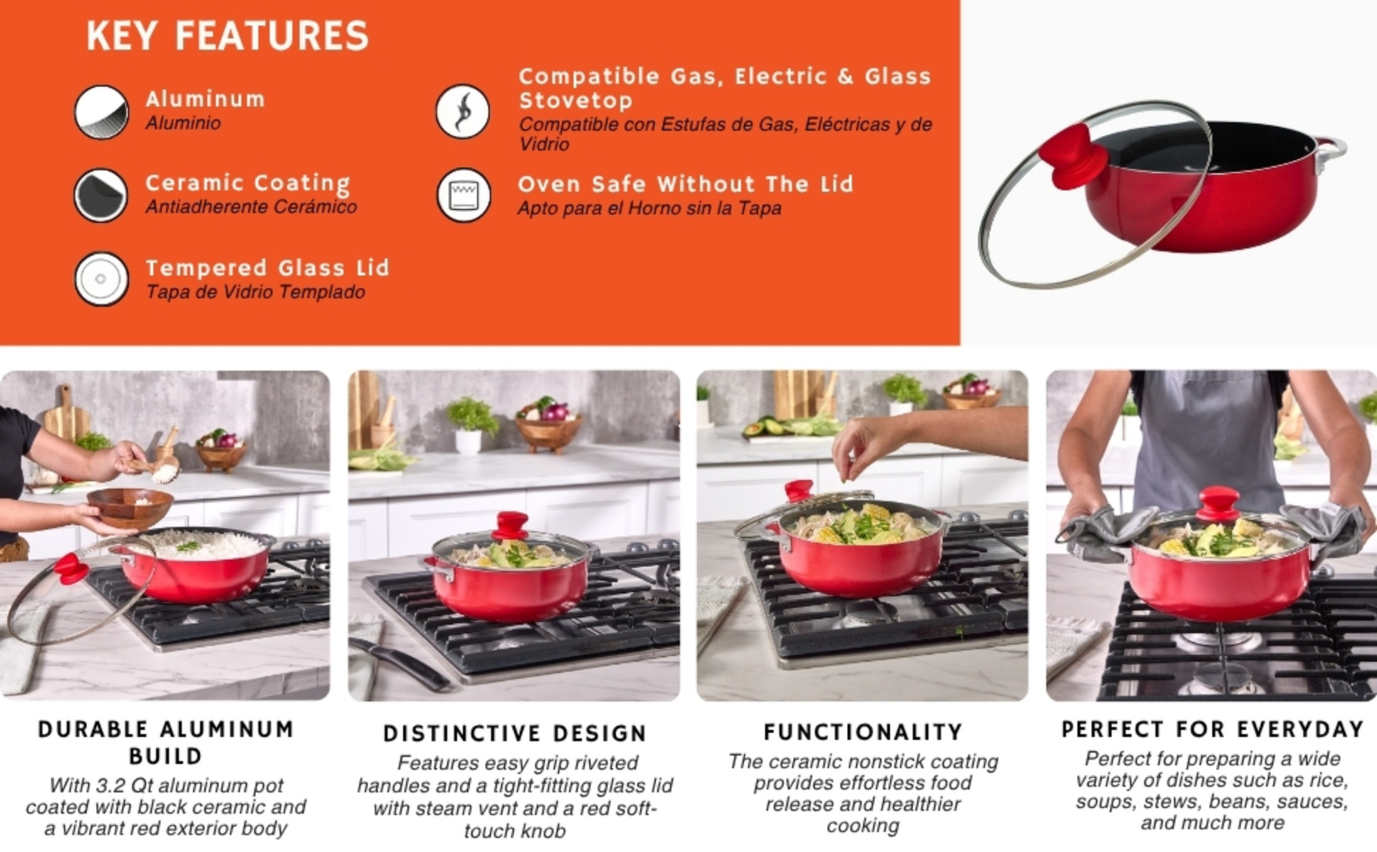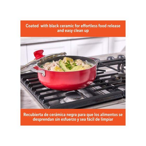 - CAPACITY & MATERIAL: 3.2 Qt, made of aluminum with a black ceramic interior and red exterior body.