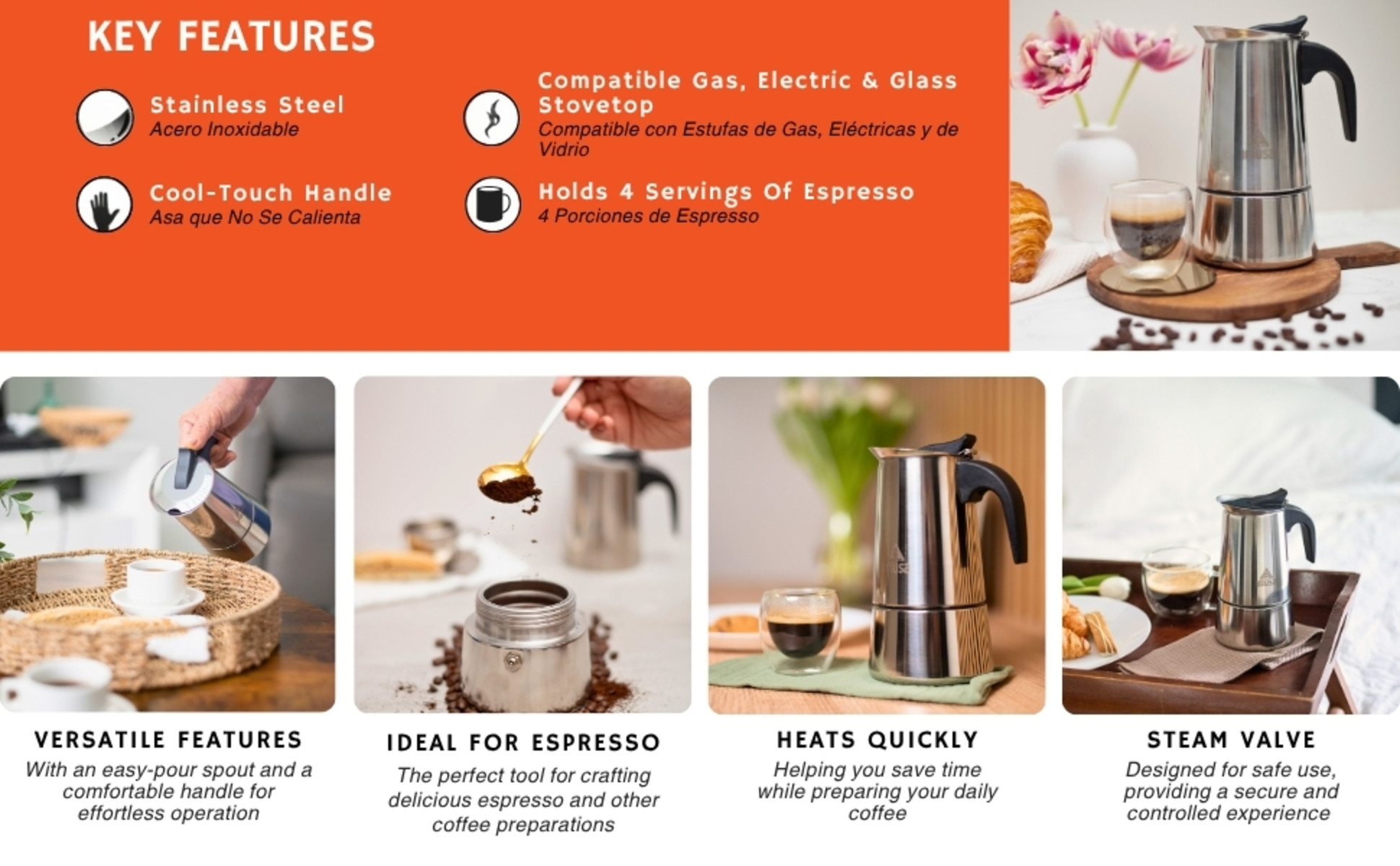 - MULTIFUNCTIONAL: Ideal for preparing a diverse array of coffee beverages, including espresso, lattes, cappuccinos, Cuban coffee, Italian style coffee, moka, and more, catering to various tastes and preferences