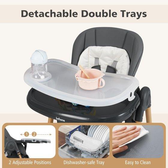 - Removable Double Trays: The tray has 2 positions to adjust, allowing parents to easily remove one tray with a single hand when the baby needs more space, while still being able to hold the baby. The thoughtful and practical design ensures convenience and ease of use. More importantly, the use of high-quality PP materials, the plate can be buckled on the back of the chair leg when idle.