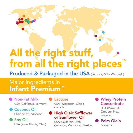 Compare to the nutrition of Enfamil NeuroPro Infant Formula. Inspired by breast milk, and crafted to support your baby's growth and development, Infant Premium Infant Formula provides complete nutrition during baby's important first year. This easy to digest, immune-supporting formula contains Immune Blend 6 with 2’-FL HMO, DHA and ARA, Vitamin C, Vitamin E, Selenium and Zinc. Human Milk Oligosaccharide, not from human milk. HMOs are immune supporting prebiotics commonly found in breast milk. HMOs aid the growth of beneficial bacteria in baby's digestive tract for infant immune support and digestive health. Expert recommended DHA for brain support. Naturally occurring MFGM components from Whey Protein Concentrate. Milk fat globule membrane composed of proteins and fats. Non-GMO ingredients, ingredients not genetically engineered. No artificial colors or flavors. No artificial growth hormones; no significant difference has been shown between milk derived from rbST-treated and non-rbST-treated cows. Certified Kosher by the Orthodox Union - OU-D. This product is not manufactured or distributed by the owner of the registered trademark Enfamil NeuroPro.