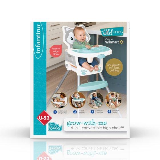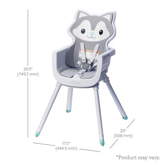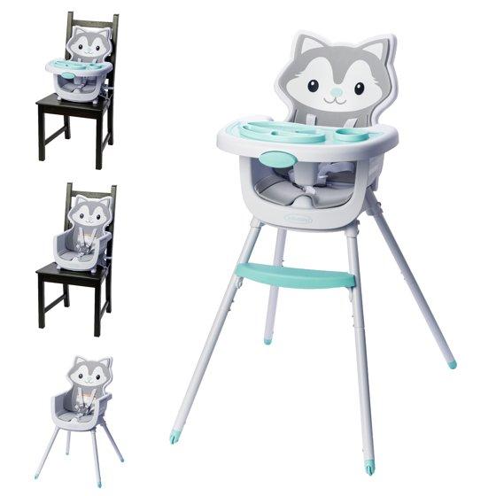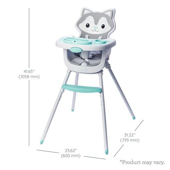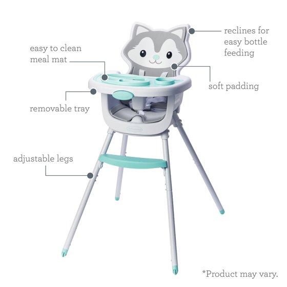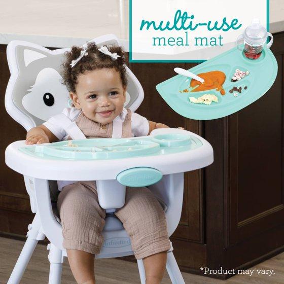 This fun, versatile high chair transforms into a 2-stage booster and toddler chair. The adjustable seat back and tray table ensure ideal positioning from tiny to toddler. Meal time is more exciting with a dishwasher-safe, multifunctional divided meal mat that encourages little ones to explore flavors and textures. An easy-to-release removable tray table makes getting baby in and out simple and convenient. A cushioned, low-density foam padding provides a soft place for your little one to sit comfortably. This high chair is smartly designed and will transform 4-ways to accommodate your little one from tiny to toddler. First, our adjustable recline mode allows you to use this high chair for bottle feeding, lightening the load of carrying your baby and making feedings less messy. Next, when your baby starts eating solids, transition to the upright high chair position or our infant booster mode with the tray table and meal mat atop, giving your baby the perfect place to explore new flavors and textures. Then, when your growing baby is ready to join you at the dining table, slide the attached booster near the dining table and remove the tray table; you could use the meal mat in this mode or any other baby-safe plate you prefer. Lastly, attach the included shorter legs to the booster to create a unique toddler chair that's great for reading books or taking a load off between playtime. With all these valuable modes, this high chair will be the only high chair you and your baby will need. Plus, it is easy to wipe clean and adorably cute, too!