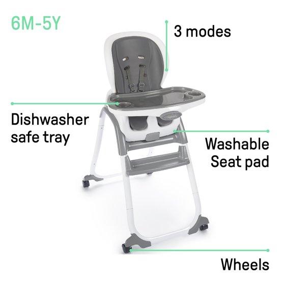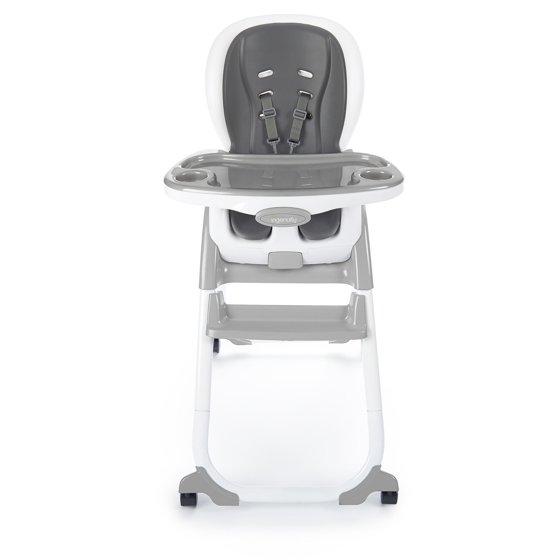 The Ingenuity SmartClean Trio Elite 3-in-1 High Chair in Slate easily transforms 3 ways from a traditional highchair to a chair top booster to a toddler seat. Easy to clean and designed to match modern home decor, this convertible highchair features thoughtful details that make mealtimes easier for babies and parents alike. The BPA-free, EasyClean tray is dishwasher safe, attaches and detaches easily, and can hold plates up to 19 inches wide. Choose the right angle for babys comfort with the reclining seat, which adjusts with the push of a button. An adjustable 5-point harness keeps baby secure and features 3 shoulder heights to grow with baby. Babies and toddlers will love the extra comfort of the cushy, EVA foam insert and parents will love that both the insert and frame wipe clean. As baby grows, transform the seat into a chair top booster by securing it to an adult dining chair with the included straps. Need space for a sibling too? Use the booster and toddler chair to seat both siblings simultaneously! Frame features wheels for easy moving or storage. Gender neutral gray color. For ages 6 months and up. Maximum weight for use: 50 pounds.