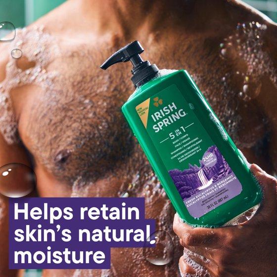 - One 30 fl oz bottle of Irish Spring 5 in 1 Moisturizing Body Wash for Men, Fresh Eucalyptus & Bergamot Scent