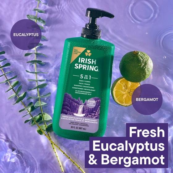 - One 30 fl oz bottle of Irish Spring 5 in 1 Moisturizing Body Wash for Men, Fresh Eucalyptus & Bergamot Scent