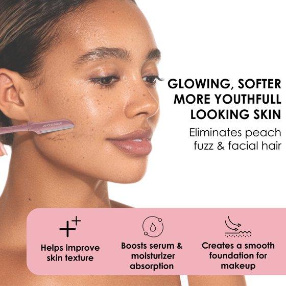 - Japonesque Precision Facial Razor 5 Pack has 6+ Skin Benefits Including: Reveals a Radiant Glow, Eliminates Peach Fuzz & Facial Hair, Exfoliates Skin, Improves Skin Texture, Boosts Serum & Moisturizer Absorption, Creates a Smooth Foundation for Makeup