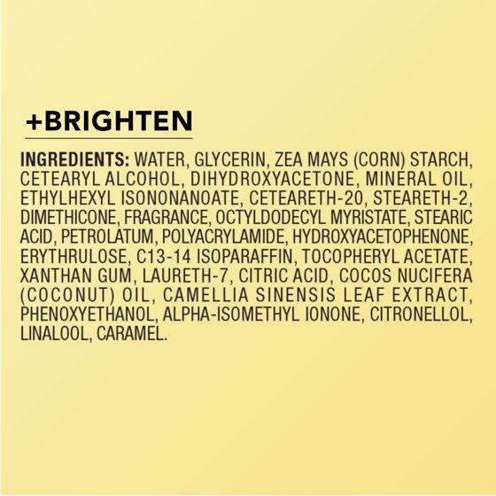 Water, Glycerin, Zea Mays (Corn) Starch, Cetearyl Alcohol, Dihydroxyacetone, Mineral Oil, Ethylhexyl Isononanoate, Propanediol, Ceteareth-20, Dimethicone, Steareth-2, Fragrance, Octyldodecyl Myristate, Stearic Acid, Petrolatum, Hydroxyethyl Acrylate/Sodium Acryloyldimethyl Taurate Copolymer, Isohexadecane, Caprylyl Glycol, Erythrulose, BHT, Polysorbate 60, Olea Europaea (Olive) Fruit Oil, Cocos Nucifera (Coconut) Oil, Avena Sativa (Oat) Meal Extract, Calendula Officinalis Flower Extract, Persea Gratissima (Avocado) Oil, Simmondsia Chinensis (Jojoba) Seed Oil, Camellia Sinensis Leaf Extract, Benzoic Acid, Caramel