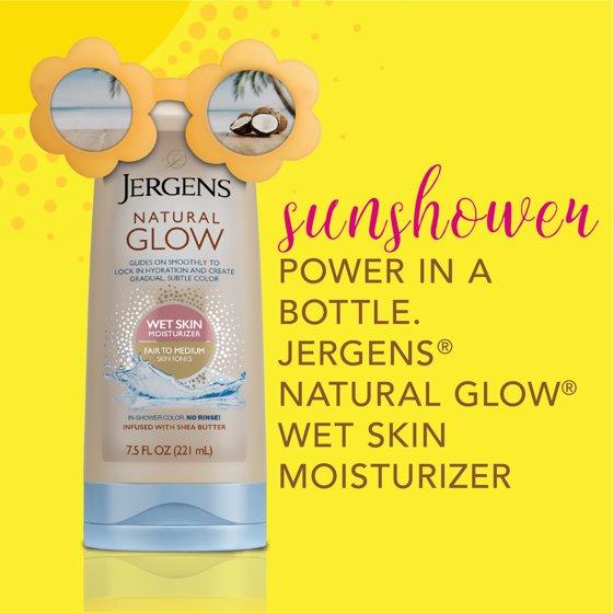 - GRADUAL SUNLESS TANNING - Jergens Natural Glow Wet Skin Body Lotion glides on smooth for in-shower application, and develops color with minimal transfer or drying time
