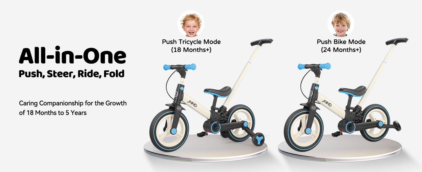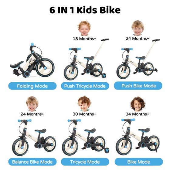 - Multifunctional Kids Bike: This 6 in 1 Kids Bike can be transformed into 6 modes: push bike mode, bike mode with training wheels, kids bike mode, balance bike mode, bike mode with kickstand and folded mode, which meet the needs of children 18-60 months, bringing children the joy of riding