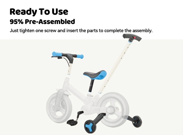 - Easy to Assemble: The new package needs to install the front wheel, please refer to the installation video on the home page. Our push handle toddler bike use a tool-less design, installation takes just a few minutes. The red button in the middle of the bike body helps you fold quickly, and the small size bike is easy to store