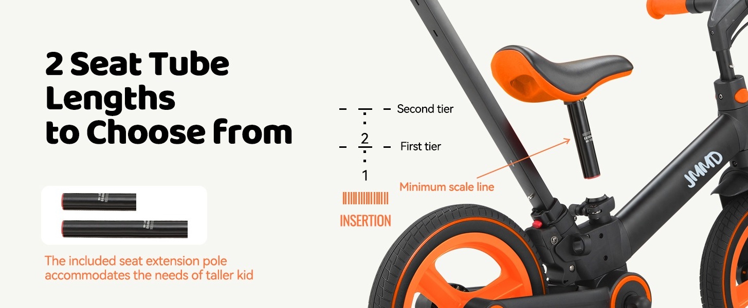 - Gifts for Beginners: JMMD toddler bike is an ideal choice for birthday or holiday gifts for boys and girls aged 18-60 months. Switching between training wheels and kickstand allows them learn to ride more easily, which enhances hand and foot coordination ability. The height of the seat and handlebar can be adjusted according to your child's height. We provide 2 seat posts with different heights. The seat adjustment range is from 13.39in to 18.5in