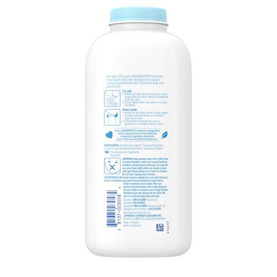 Johnson's baby powder with naturally derived cornstarch and Aloe & Vitamin E gently absorbs moisture to soothe baby's delicate and unique skin and leaves it feeling soft and smooth. Specially formulated for babies and infants, this soothing baby powder is dermatologist tested and clinically proven mild and gentle. This hypoallergenic baby powder is free of parabens, phthalates, dyes, and harsh fragrances. Formulated to be gentle, never harsh, this lightweight cornstarch baby powder for baby skin care has a silky texture for easy application. It's great for kids and adults, too! To use this infant baby powder, shake powder directly into your hand away from the face before smoothing onto skin. Close the baby powder container tightly after use and store in a cool, dry place.