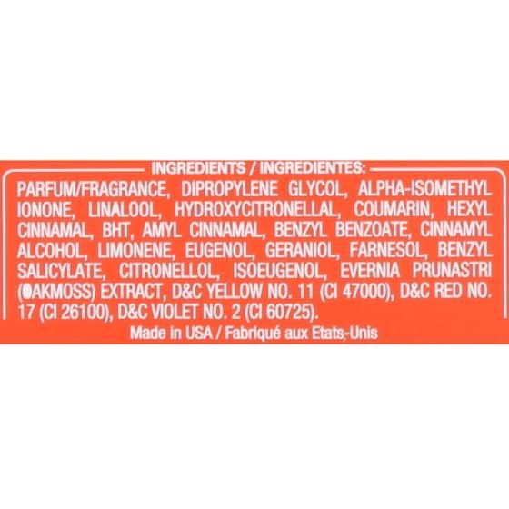 Fragrance, Dipropylene Glycol, Silica, Isopropyl Myristate, Propylparaben, D&C Yellow No. 11, D&C Red No. 17, Ext. D&C Violet No. 2.