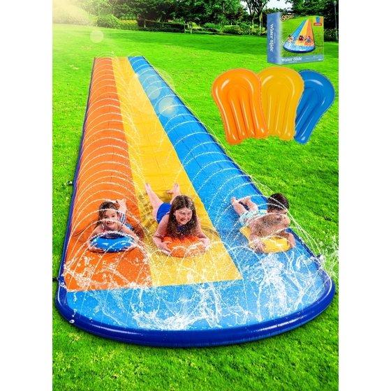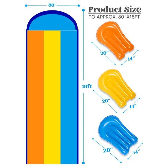 - Joyfy Triple Lawn Water Slide includes an 18ft x 80in Triple Lawn Water Slide, 3 inflatable inflatable boards, 20" x 14", two sides built sprinkler, and 4 ground stakes, featuring with end splash pool.
