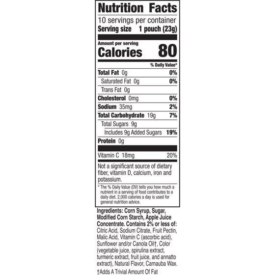 Corn Syrup, Sugar, Modified Corn Starch, Apple Juice Concentrate. Contains 2% or Less of: Citric Acid, Sodium Citrate, Fruit Pectin, Malic Acid, Vitamin C (Ascorbic Acid), Sunflower and/or Canola Oil(a), Color (Vegetable Juice, Spirulina Extract, Turmeric Extract, Fruit Juice, and Annatto Extract), Natural Flavor, Carnauba Wax. (a) Adds a Trivial Amount of Fat.