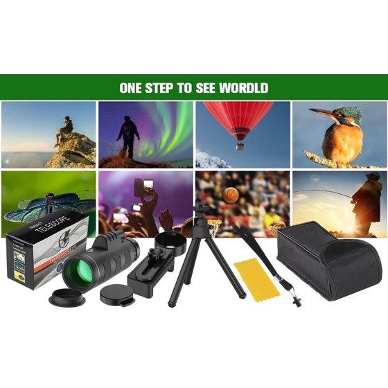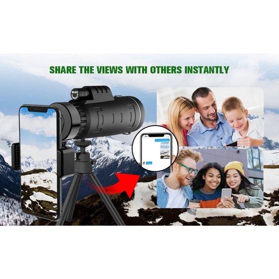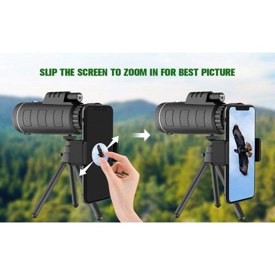 Juyafio 40X60 High Definition Monocular Telescope for Smartphone. Our topvision telescope equipped with a full 40x magnification and FMC lens provides you with a clearer and Bright of view.Perfect for hiking,hunting,climbing,bird watching,concerts,watching wildlife and scenery.