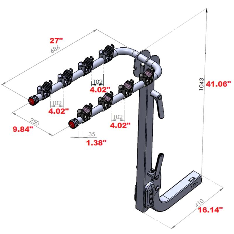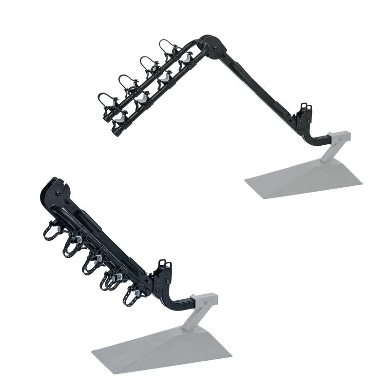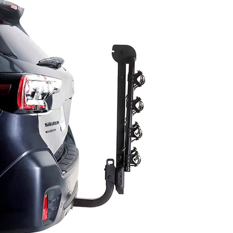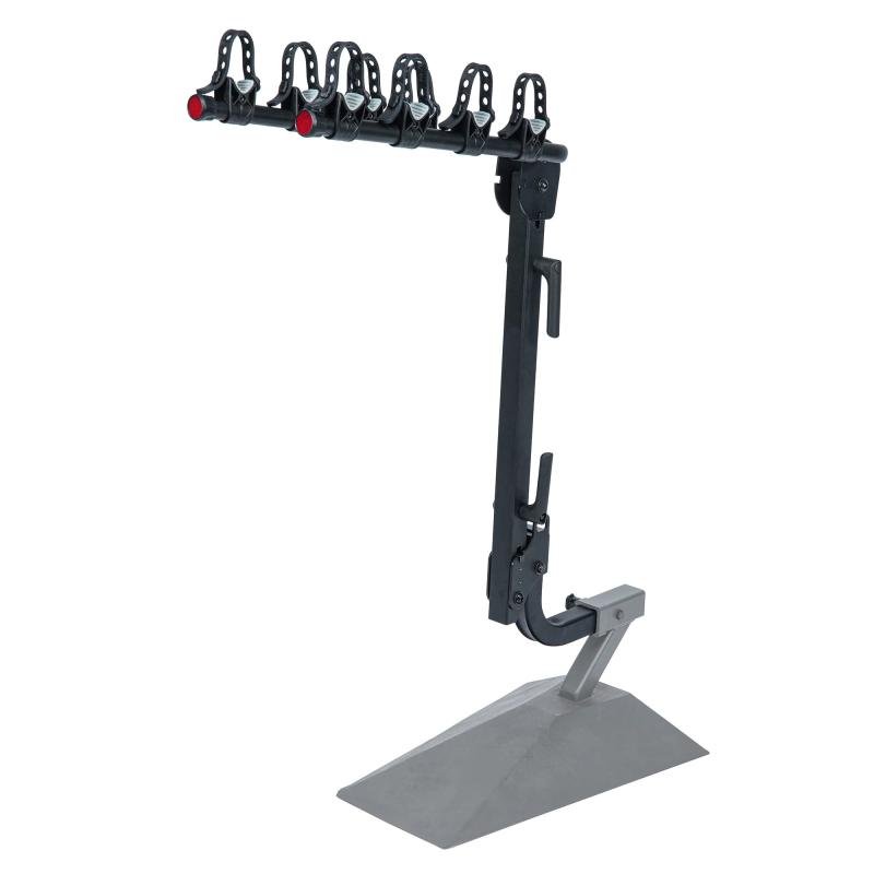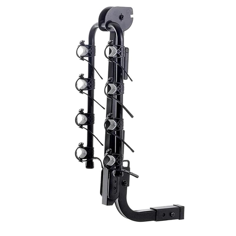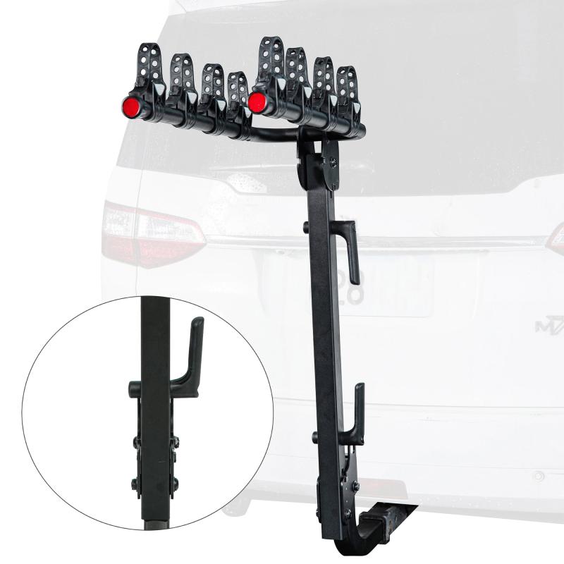 - Rear-mounted bike rack is constructed from heavy-duty powder-coated steel that can carry up to 4 bikes with a total weight of 120 pounds