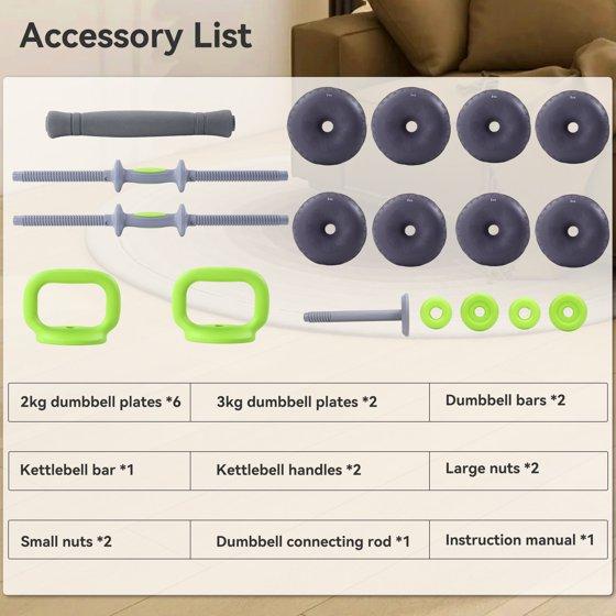 - 4-in-1 Multifunctional Dumbbell Set:Can be assembled into dumbbells, barbells, and kettlebells; The soft material also allows it to be used as a medicine ball or weight plate for functional training.