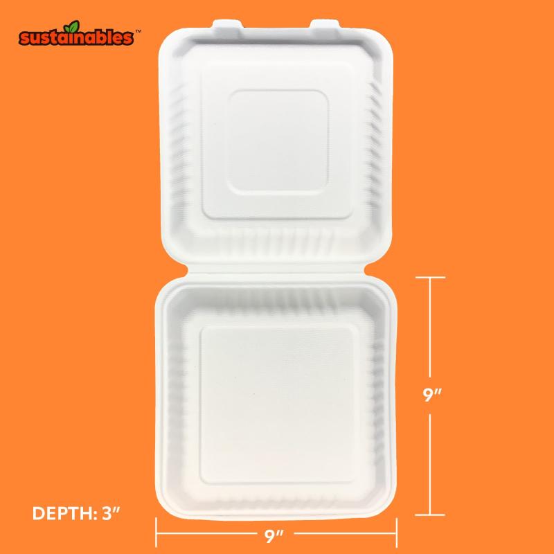 Sustainables™ 1 Compartment Hinged Lid Containers are perfect for restaurants, cafeterias, food trucks, small business needs and any food storage for on the go / carryout. Each pack contains 50 Hinged Lid To Go Containers with interlocking tabs for secure easy handling. Sustainables™ Hinged Lid Containers are stackable with reclosable bag to for safe and convenient storage. Sustainables™ 9” x 9” 1 Compartment Hinged Lid Containers are strong, sturdy, soak and cut resistant, eco-friendly packaging solutions and holds a variety of wet, heavy foods. Our containers are microwave safe, so you can heat up your favorite leftovers to enjoy a second time!
