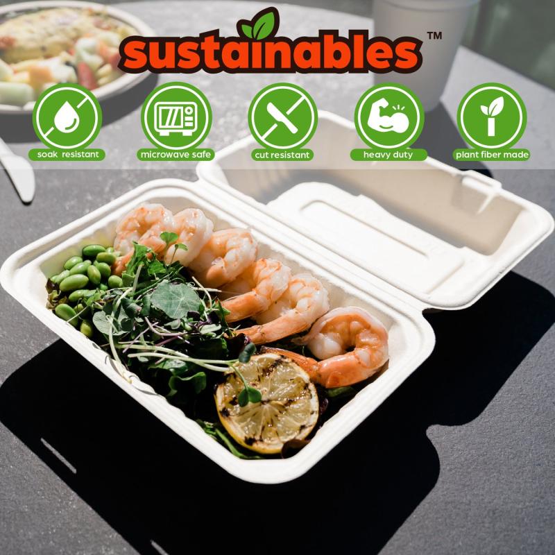 Sustainables™ Multi-Use Hinged Lid Containers are perfect for restaurants, cafeterias, food trucks, small business needs and any food storage for on the go / carryout. Each pack contains 75 Hinged Lid To-Go Containers with interlocking tabs for secure easy handling. Sustainables™ Hinged Lid Containers are stackable with reclosable bag to for safe and convenient storage. Sustainables™ 9” x 6” Multi-Use Hinged Lid Containers are perfect for hoagies, hot dogs, sub sandwiches and more! These containers are strong, sturdy, soak and cut resistant, eco-friendly packaging solutions and holds a variety of wet, heavy foods. Our containers are microwave safe, so you can heat up your favorite leftovers to enjoy a second time!