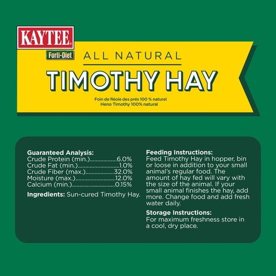 Feeding Instructions:Provide Timothy Hay in a feed hopper, bin or loose. The amount offered will vary with the size of the animal. Small animals benefit from Timothy Hay as a fiber source, chewing material to discourage hairballs and as a nesting material. To complete diet, feed Forti-Diet® food daily in a separate container. Change food and add fresh water daily.