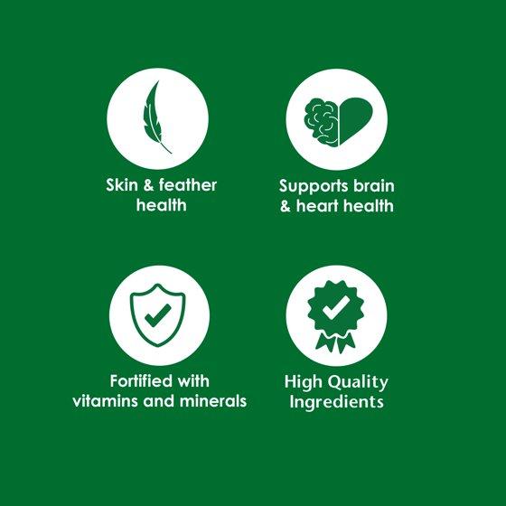 - PROMOTES SKIN AND FEATHER HEALTH to support a bright and healthy appearance