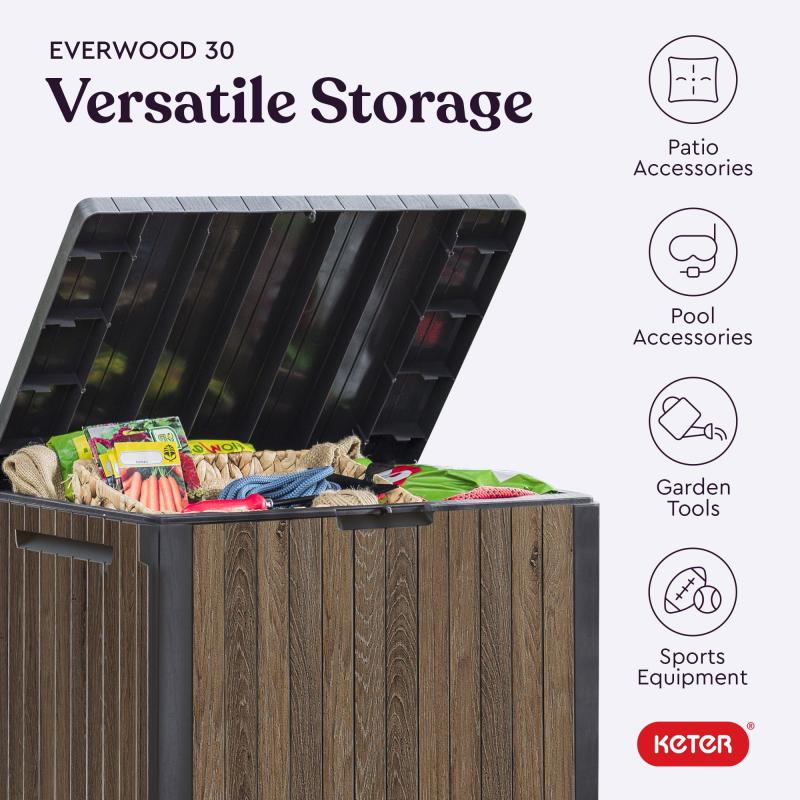 Keter Signature Everwood 30 Gallon Resin Outdoor Storage Box and Patio Furniture Side Table for Pool and Garden Accessories, Walnut