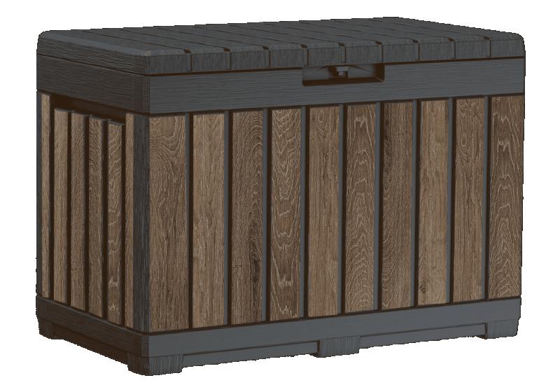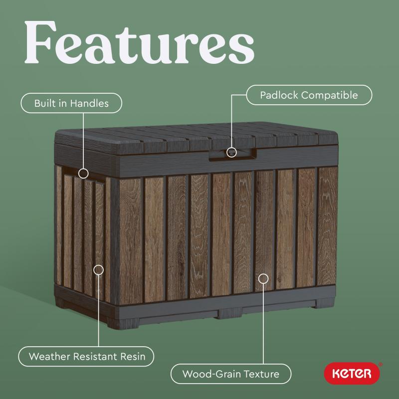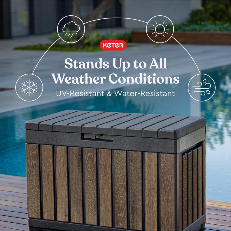 Keter Signature Everwood 50 Gallon Resin Outdoor Storage Box and Patio Furniture Side Table for Pool and Garden Accessories, Walnut