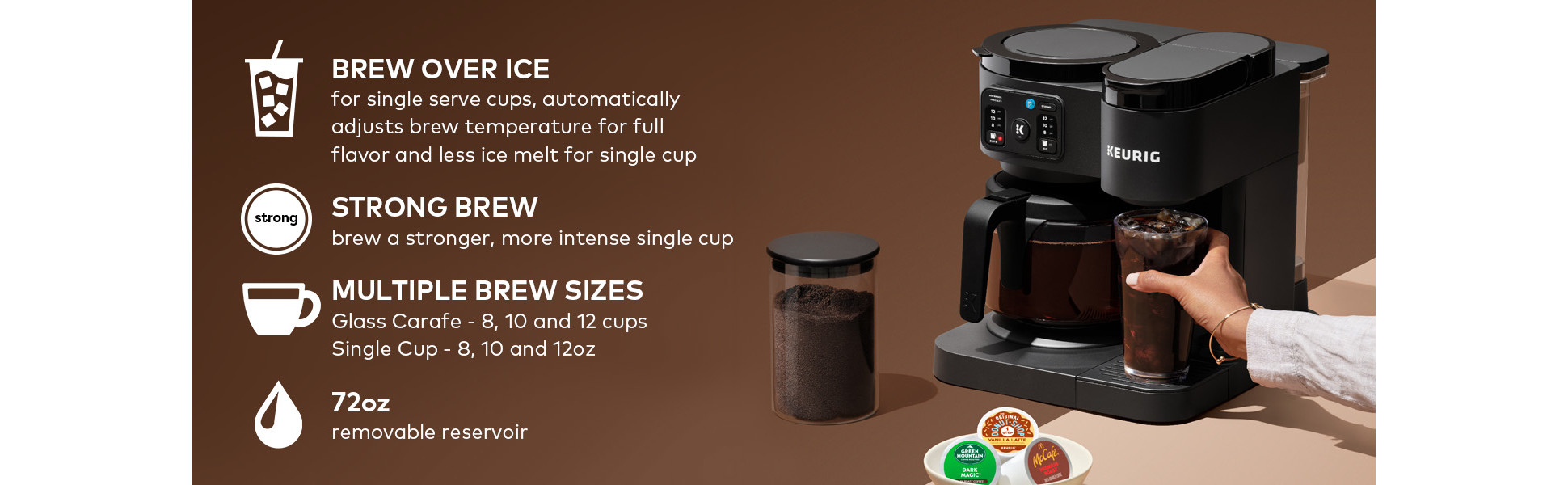 • BREW OVER ICE: Adjusts temperature for maximum flavor and less ice melt for iced coffees and teas.