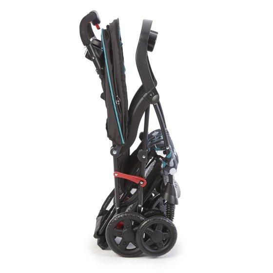 - Front swivel wheels and locking brake system plus stroller lock for a slim fold. Folds down to only 12" wide making it a great option for airplane and road trips