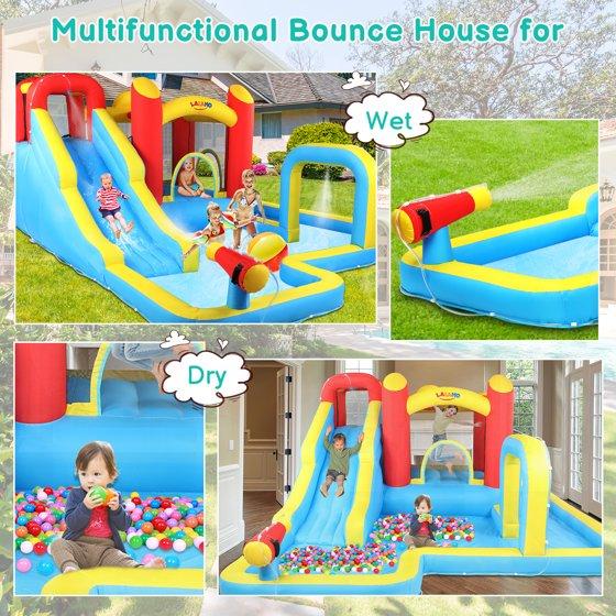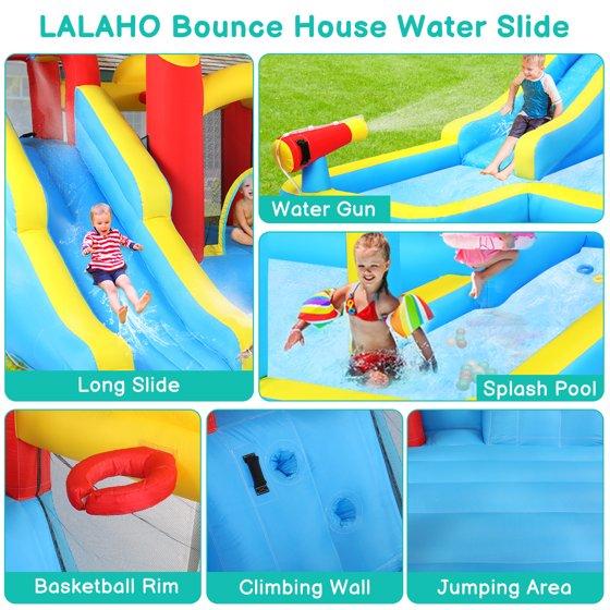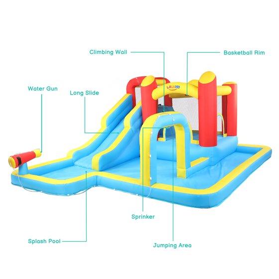 - 【Inflatable Water Slide Bounce House with Long Slide】 Long water slide with built-in sprayer creates fast rides and cool splash-downs, turning any yard into an inflatable water park for kids.