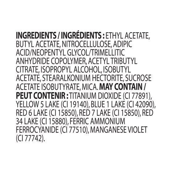 INGREDIENTS/ INGRÉDIENTS : ETHYL ACETATE, BUTYL ACETATE, NITROCELLULOSE, ADIPIC ACID/NEOPENTYL GLYCOL/TRIMELLITIC ANHYDRIDE COPOLYMER, ACETYL TRIBUTYL CITRATE, ISOPROPYL ALCOHOL, ISOBUTYL ACETATE, STEARALKONIUM HECTORITE, SUCROSE ACETATE ISOBUTYRATE, MICA. MAY CONTAIN/ PEUT CONTENIR : TITANIUM DIOXIDE (CI 77891), YELLOW 5 LAKE (CI 19140), BLUE 1 LAKE (CI 42090), RED 6 LAKE (CI 15850), RED 7 LAKE (CI 15850), RED 34 LAKE (CI 15880), FERRIC AMMONIUM FERROCYANIDE (CI 77510), MANGANESE VIOLET (CI 77742).