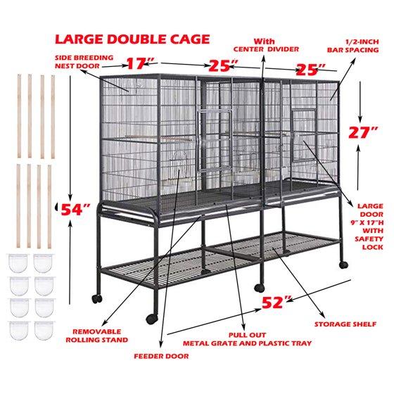 This spacious and durable double bird cage with a center divider and removable rolling stand is perfect for housing a variety of small to medium-sized birds. Crafted with a sturdy wrought iron frame, it features a large 51-inch by 17-inch by 54-inch size, narrow 1/2-inch bar spacing to prevent escape, and two side pull-up nesting box doors. The all-metal construction includes a pull-out wire grate bottom and slide-out plastic tray for easy cleaning, while the wooden stand with perches, feeder doors, and storage shelf provides a comfortable and functional environment for your feathered friends. With four heavy-duty casters, this cage can be easily moved around, and the non-toxic epoxy painting ensures a safe and stylish addition to your home.
