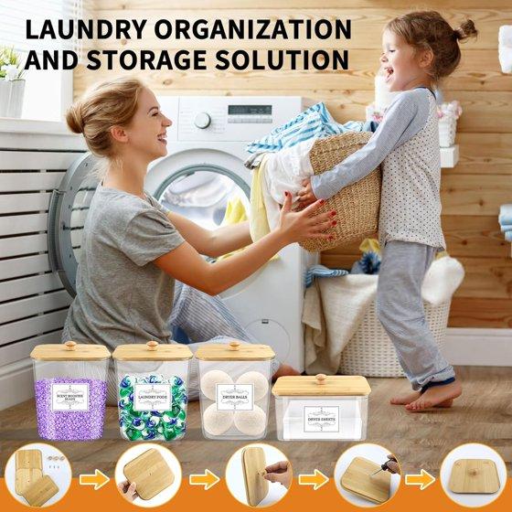 Laundry Pods Container & Dryer Sheet Holder, 4Pack Laundry Room Organization and Storage, Laundry Detergent Power Container with Bamboo Lids,Labels, Scoop