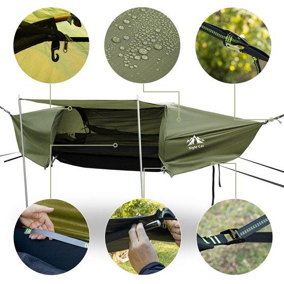 - Mosquito Nets and Vestibule Rainfly🌳 Equipped with mosquito net makes you keep away from annoying mosquitos or bugs to have a safe and comfortable sleeping outside. When using with the rain fly, the plane hammock becomes a heavy rain waterproof tent with nice air flow. The rainfly can be setup a little porch using your trekking pole or outdoor. It provides a sun shade to sit under with your chair and enjoy coffee and view.