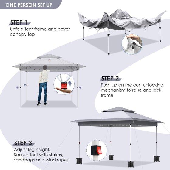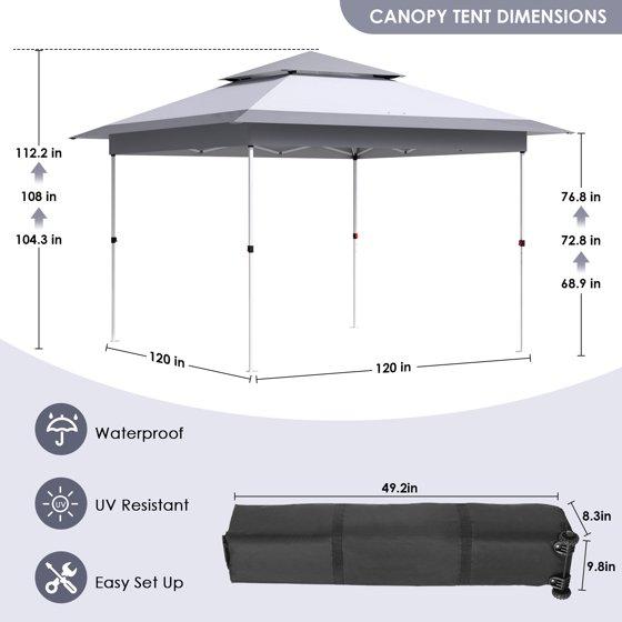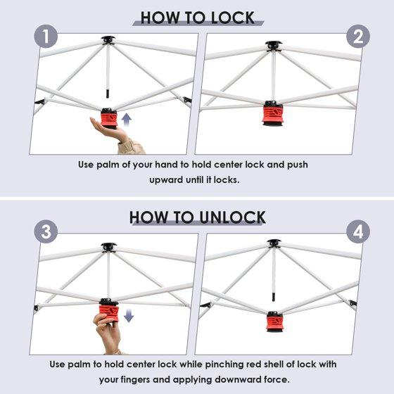 - LAZY BUDDY 12ft pop up canopy tent features a one-button central locking technology, allowing one person to set it up or take it down easily. It offers three height adjustment levels to accommodate various needs.