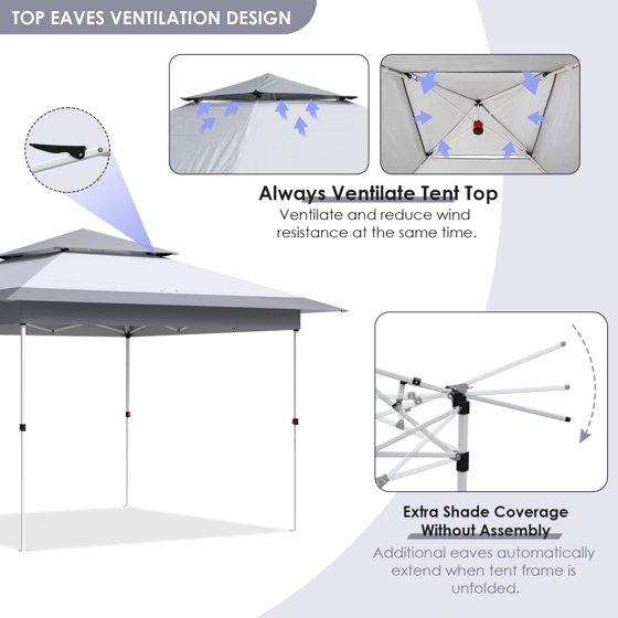 LAZY BUDDY 12' x 12' pop-up canopy tent provides comfortable shade for your backyard or travels. Its extended eaves design offers 144 square feet of coverage, accommodating up to 6-8 people. The top vent promotes airflow, ensuring good ventilation and stability.