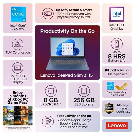 Lenovo IdeaPad Slim 3i 15.6" Laptop, Intel Core i3-N305, 8GB RAM, 256 SSD, Abyss Blue