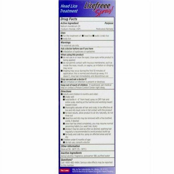 - A safe way to kill lice without potentially toxic pesticides. Active Ingredients: Natrum Muriaticum 2X (Sodium Chloride USP) Inactive Ingredients: Benzyl Alcohol; Fragrance; Poloxamer 188; Purified Water Uses: For the treatment of: head lice, pubic (crab) lice, body lice. 100% effective in killing lice and eggs.* Starts working on contact. Convenient, no rinse formula. No harmful pesticide residue. Includes a stainless steel comb. Patent pending formula kills lice and nits through dehydration. Herbal spice scent makes application pleasant for parent and child. Safe for repeated applications. *In vitro testing shows LiceFreee Spray is 100% effective in killing both lice and nits when used as directed.