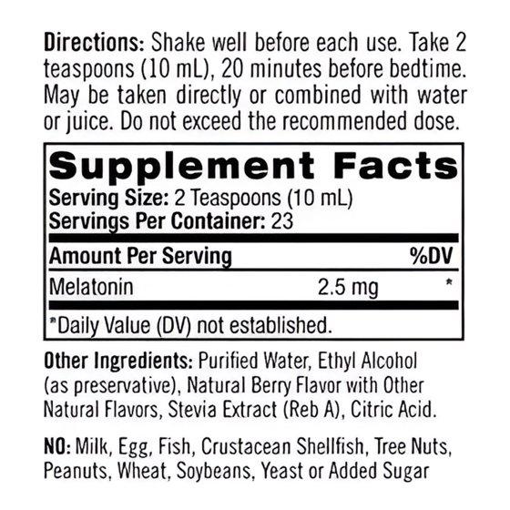 Natrol - Liquid Melatonin Sleep Support Berry 2.5 mg. - 8 fl. oz. (237 mL) Supplement Facts Serving Size: 2 Teaspoons (10 mL) Servings Per Container: 23 Amount Per Serving %DV Melatonin 2.5 mg * *Daily Value (DV) not established. Other Ingredients: Purified Water, Ethyl Alcohol (as preservative), Natural Berry Flavor with other Natural Flavors, Stevia Extract (Reb A), Citric Acid.No: Milk, Egg, Fish, Crustacean Shellfish, Tree Nuts, Peanuts, Wheat, Soybeans, Yeast or Added Sugar.