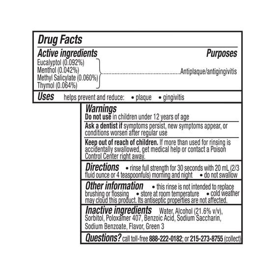 Active Ingredients: Eucalyptol (0.092 %), Antiplaque/Antigingivitis; Menthol (0.042 %), Antiplaque/Antigingivitis; Methyl Salicylate (0.060 %), Antiplaque/Antigingivitis; Thymol (0.064 %), Antiplaque/Antigingivitis. Inactive Ingredients: Water, Alcohol (21.6%), Sorbitol, Poloxamer 407, Benzoic Acid, Sodium Saccharin, Sodium Benzoate, Flavor, Green 3.