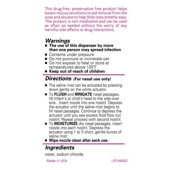 - Sterile saline mist flushes mucus from little ones’ noses