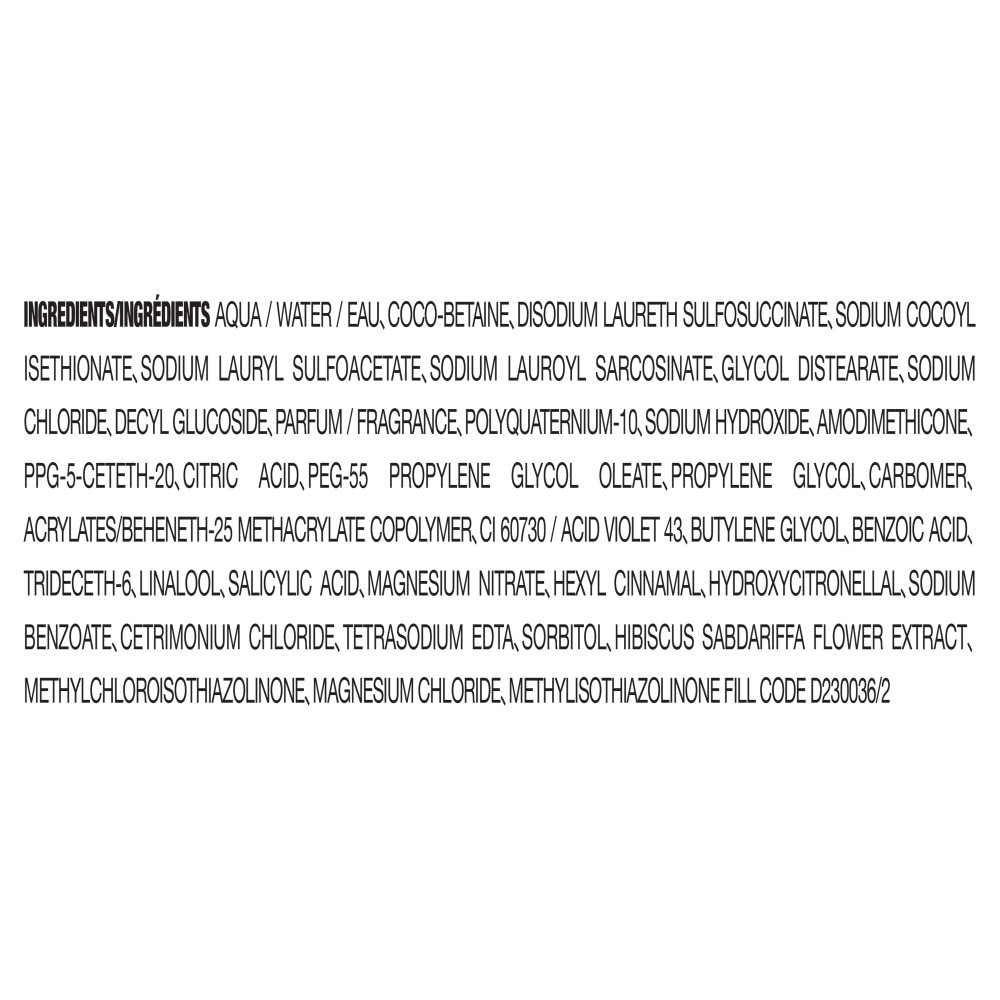AQUA / WATER / EAU、COCO-BETAINE、DISODIUM LAURETH SULFOSUCCINATE、SODIUM COCOYL ISETHIONATE、SODIUM LAURYL SULFOACETATE、SODIUM LAUROYL SARCOSINATE、GLYCOL DISTEARATE、SODIUM CHLORIDE、DECYL GLUCOSIDE、PARFUM / FRAGRANCE、POLYQUATERNIUM-10、SODIUM HYDROXIDE、AMODIMETHICONE、PPG-5-CETETH-20、CITRIC ACID、PEG-55 PROPYLENE GLYCOL OLEATE、PROPYLENE GLYCOL、CARBOMER、ACRYLATES/BEHENETH-25 METHACRYLATE COPOLYMER、CI 60730 / ACID VIOLET 43、BUTYLENE GLYCOL、BENZOIC ACID、TRIDECETH-6、LINALOOL、SALICYLIC ACID、MAGNESIUM NITRATE、HEXYL CINNAMAL、HYDROXYCITRONELLAL、SODIUM BENZOATE、CETRIMONIUM CHLORIDE、TETRASODIUM EDTA、SORBITOL、HIBISCUS SABDARIFFA FLOWER EXTRACT、METHYLCHLOROISOTHIAZOLINONE、MAGNESIUM CHLORIDE、METHYLISOTHIAZOLINONE FILL CODE D230036/2