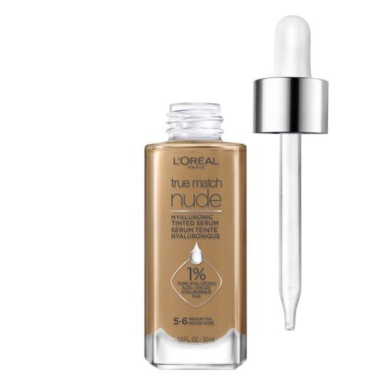 L'Oreal Paris True Match Hyaluronic Tinted Serum Foundation Makeup, 5-6 Medium Tan, Makeup Skincare = The Perfect Match. Introducing The 1st tinted serum with 1 percent Hyaluronic Acid. With this tinted serum skin instantly looks brighter, even and feels hydrated for a nude, radiant finish. The 1% Hyaluronic acid gives skin a hydrated feel and smooths over time, while the luminous mineral pigments provide lightweight coverage for a brightened complexion. Available in 14 nude, radiant shades that blend to match a variety of skintones. Find Your true match today 100% satisfaction guaranteed.* *Money back guarantee, up to $14.99 after coupon (sales tax and shipping will not be refunded). Restrictions apply.